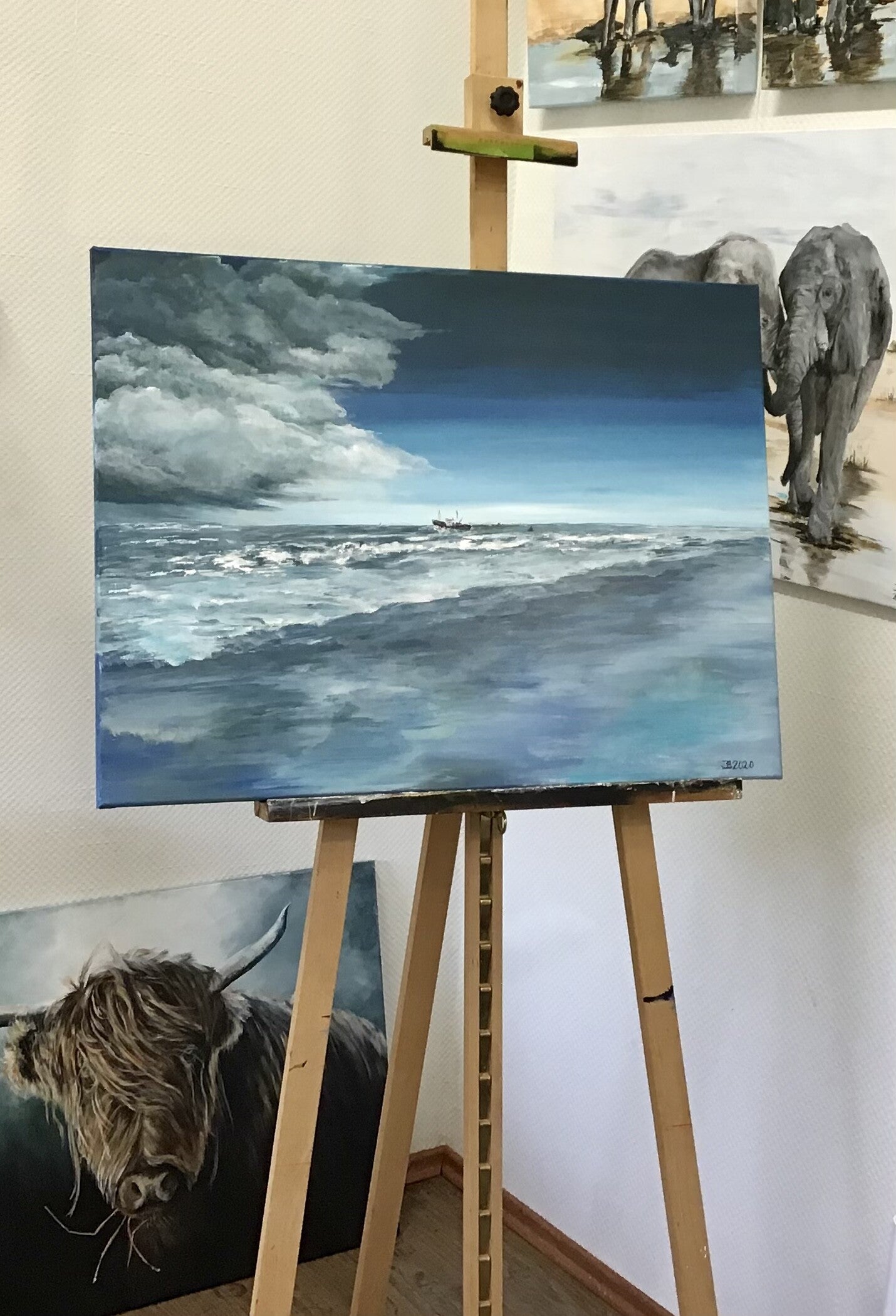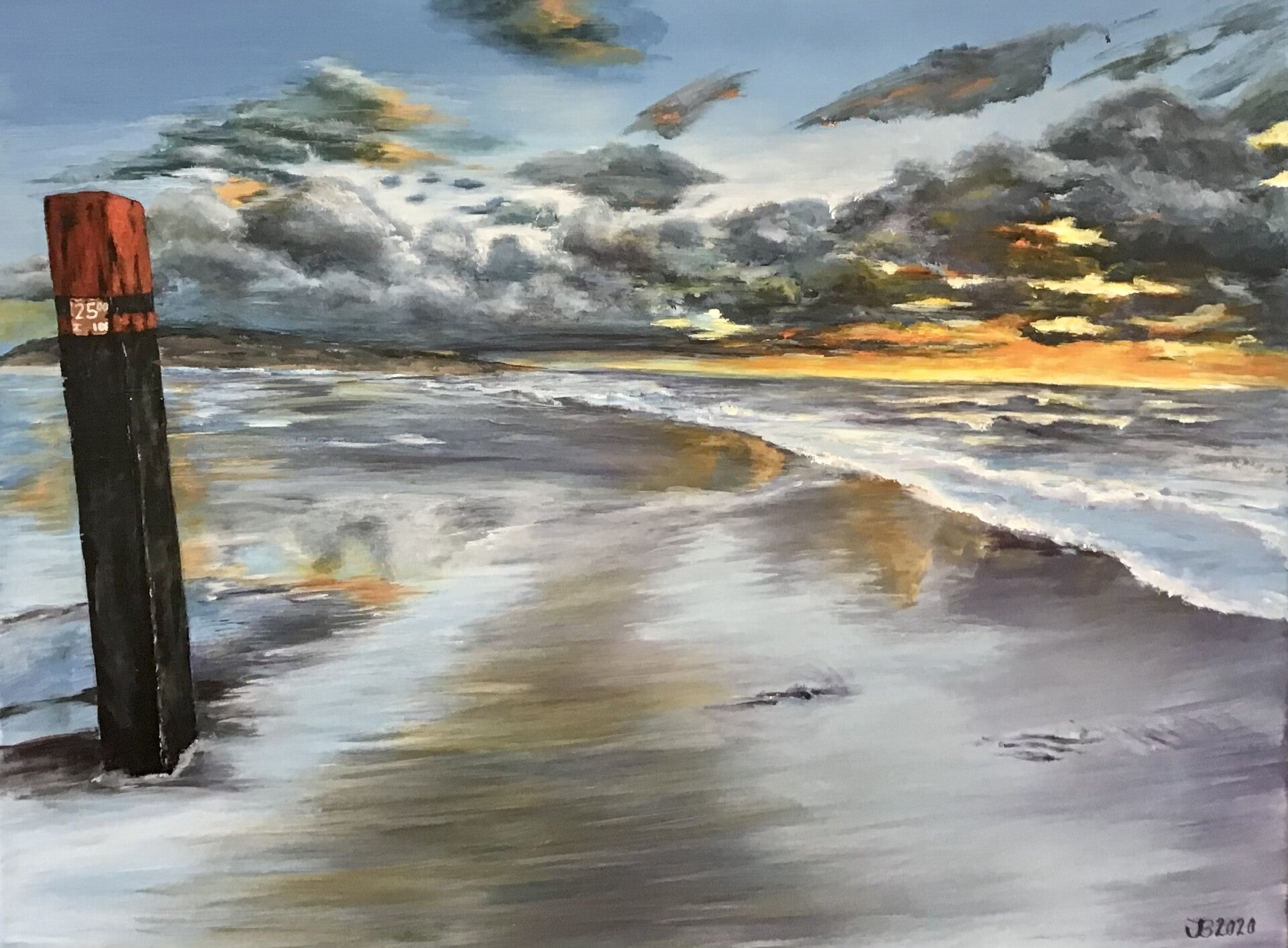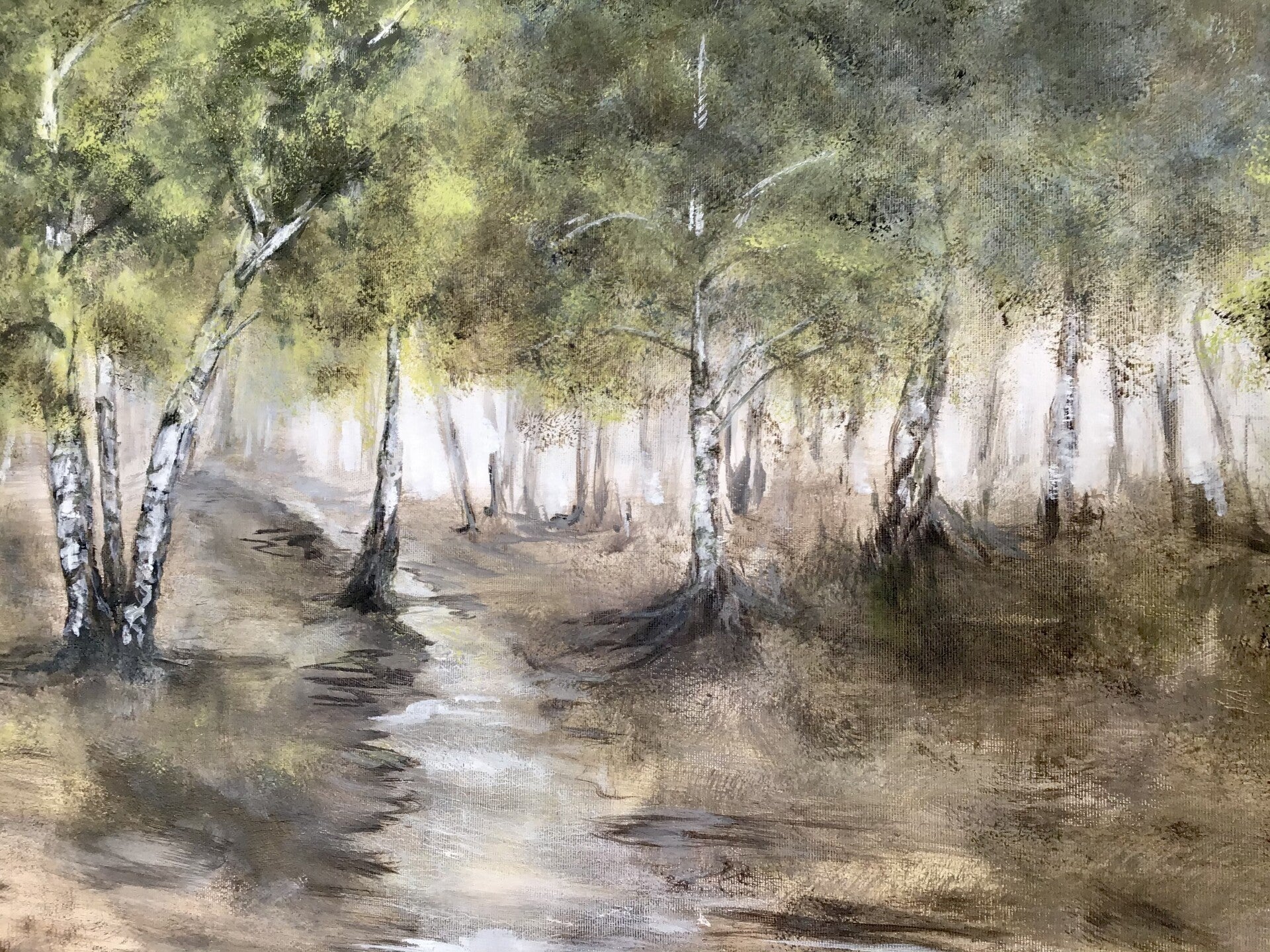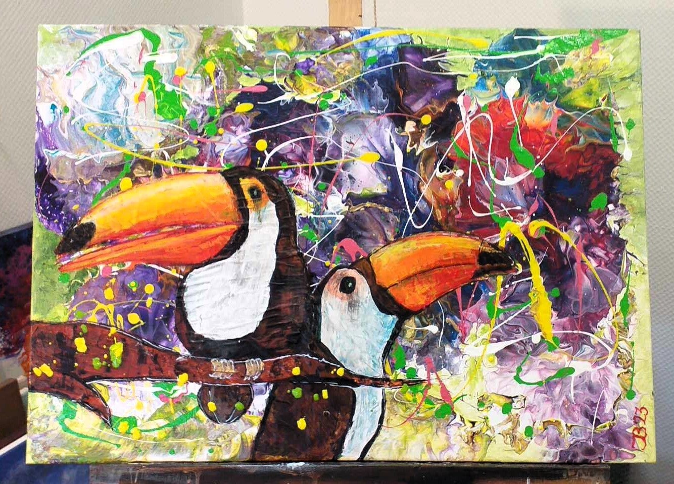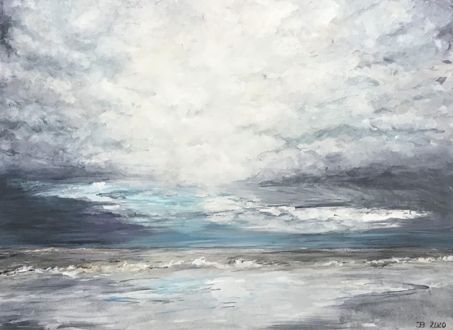 Acryl geschilderd op grof papier geplakt op board, klaar om op te hangen.